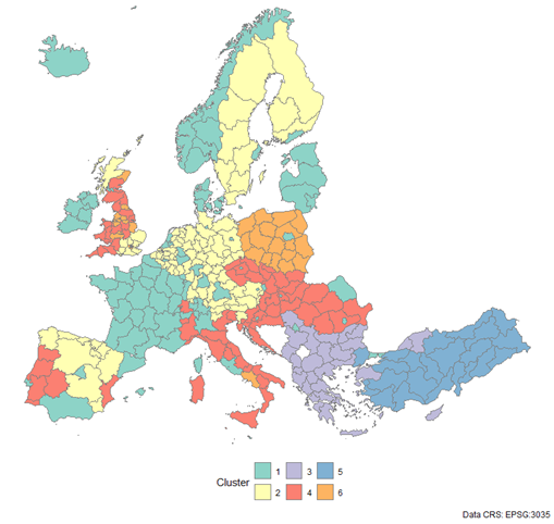 R-Map’s comprehensive typology of European regions provides insights into how remote working arrangements (RWAs) are reshaping territorial dynamics across Europe. These insights reflect remote work’s regional footprint and provide solid evidence for designing targeted regional policies and prioritising digital infrastructure investment, contributing to a balanced and resilient regional development across Europe. 334 NUTS2 regions were classified across the EU27, the UK and Türkiye based on demographic trends and economic resilience revealing striking regional contrasts, captured in six distinct regional clusters.